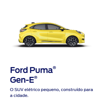 **Campanha válida até 31 de Dezembro de 2025. Preço sem IVA apenas válido para Clientes Frotas & ENIs. Limitada ao stock existente. PUMA GEN-E GEN-E 54kWh 168CV FWD em Aluguer Operacional de Viaturas, prazo 60 Meses / 75.000km. Sem entrada inicial. Inclui os serviços: Aluguer, IUC, IPO, Manutenção Plus, Pneus ilimitados, Viatura de substituição Ilimitada, Assistência em viagem, Seguro de Responsabilidade Civil (capital coberto 50,000,000€) e Danos próprios com franquia de 2%. Inclui despesas de preparação e legalização. Condições válidas até 31/10/2025 para clientes empresa ,e limitada ao stock existente em Portugal Continental (para as ilhas acrescem custos de transporte) nos concessionários FORD aderentes. Contrato FORD RENTING, condicionado à aprovação do Comité de Crédito da Arval Service Lease, SA. Imagens meramente ilustrativas. Gama elétrica: Consumo elétrico (kWh/100 Km) ciclo combinado 13,1 a 21,2. O alcance elétrico certificado pode ser alcançado com uma bateria totalmente carregada num Puma Gen-E com bateria de autonomia alargada - dependendo da série existente e da configuração da bateria. O alcance elétrico real pode variar devido a vários fatores (por exemplo, condições climáticas, estilo de condução, perfil da rota, condição do veículo, idade e condição da bateria de íons de lítio).